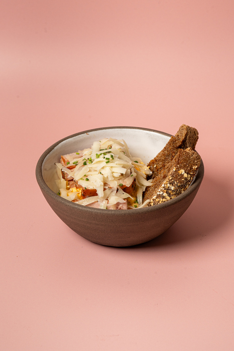 Σάλτσα cheddar, μπέικον, μαγιονέζα, τηγανητό αυγό & τριμμένο μπισκότο